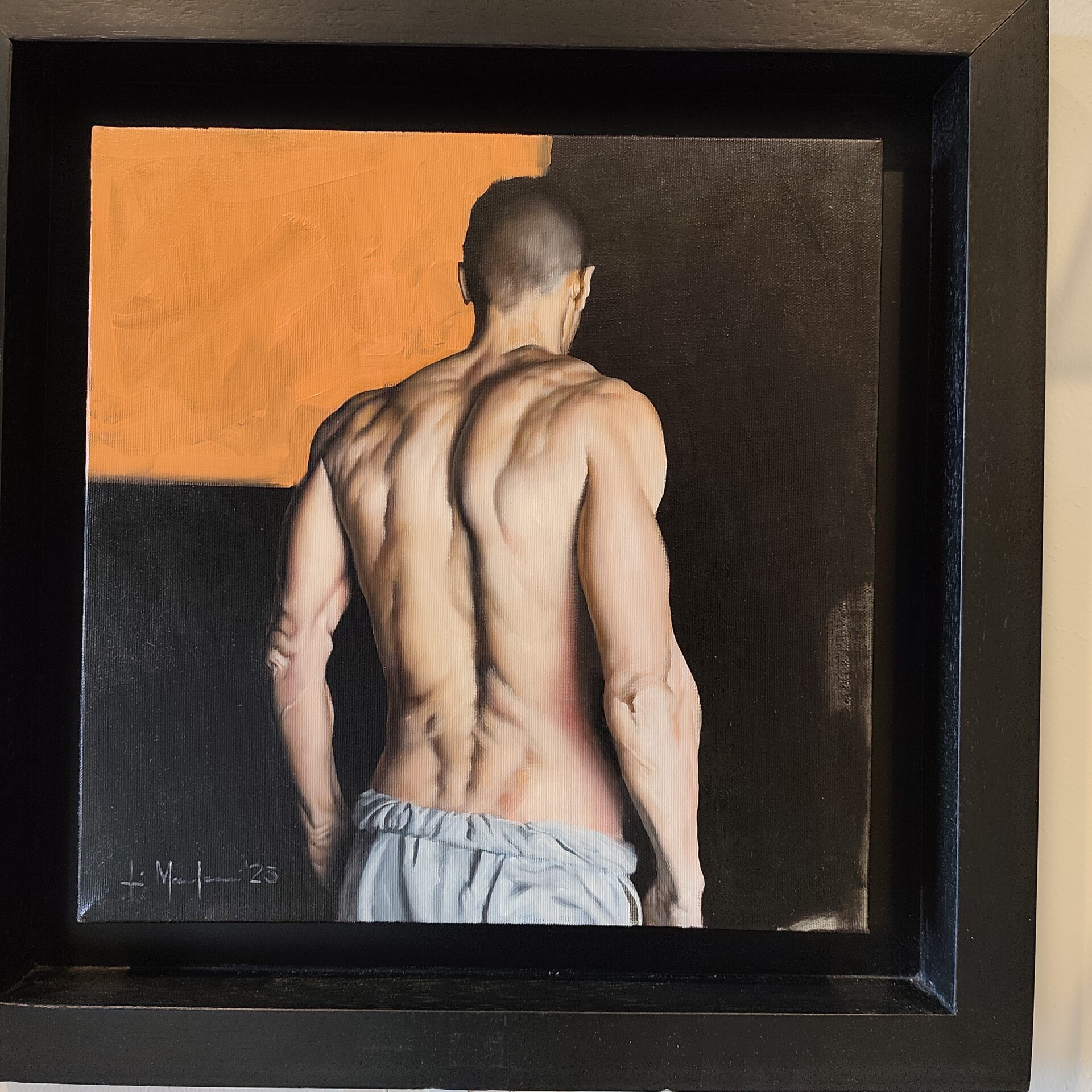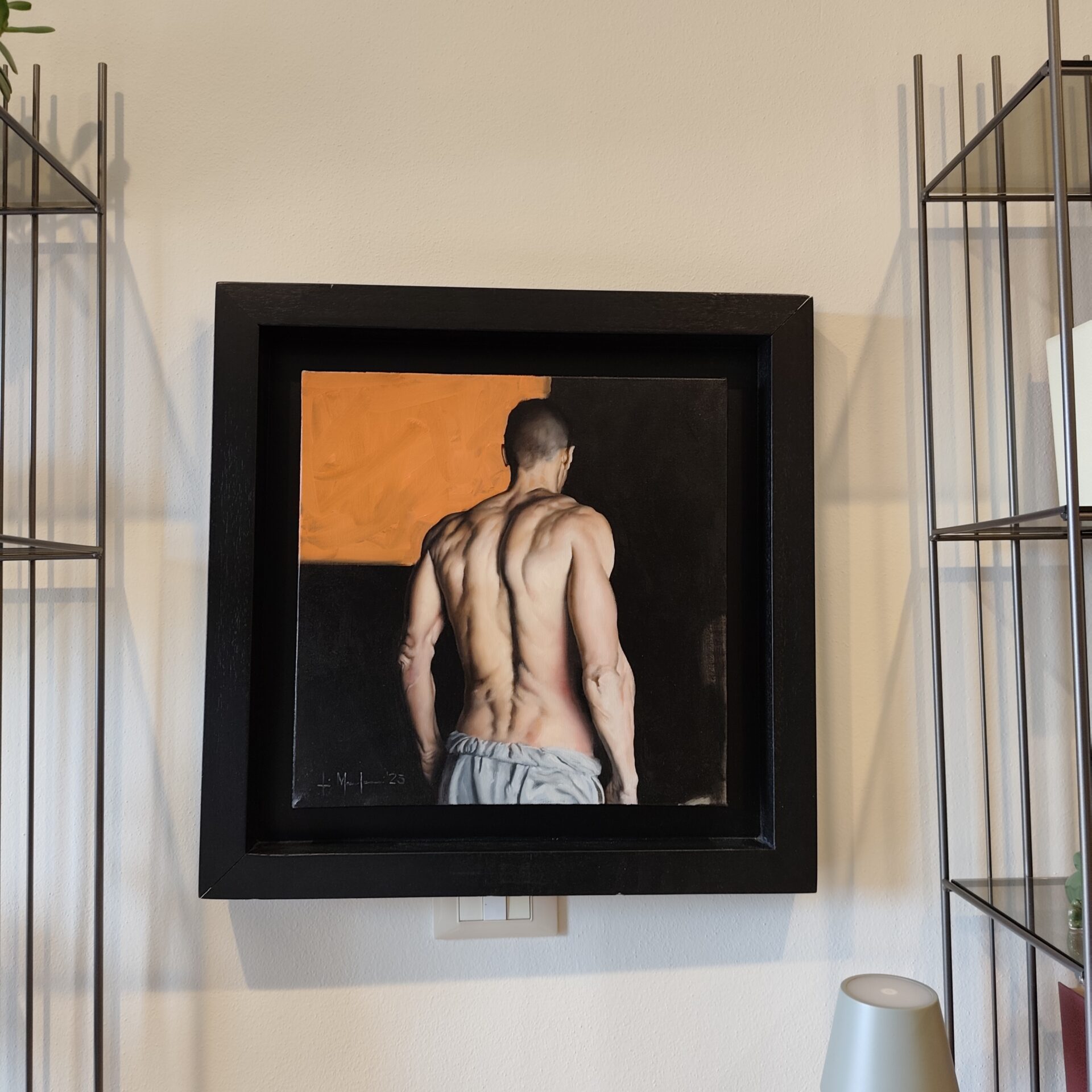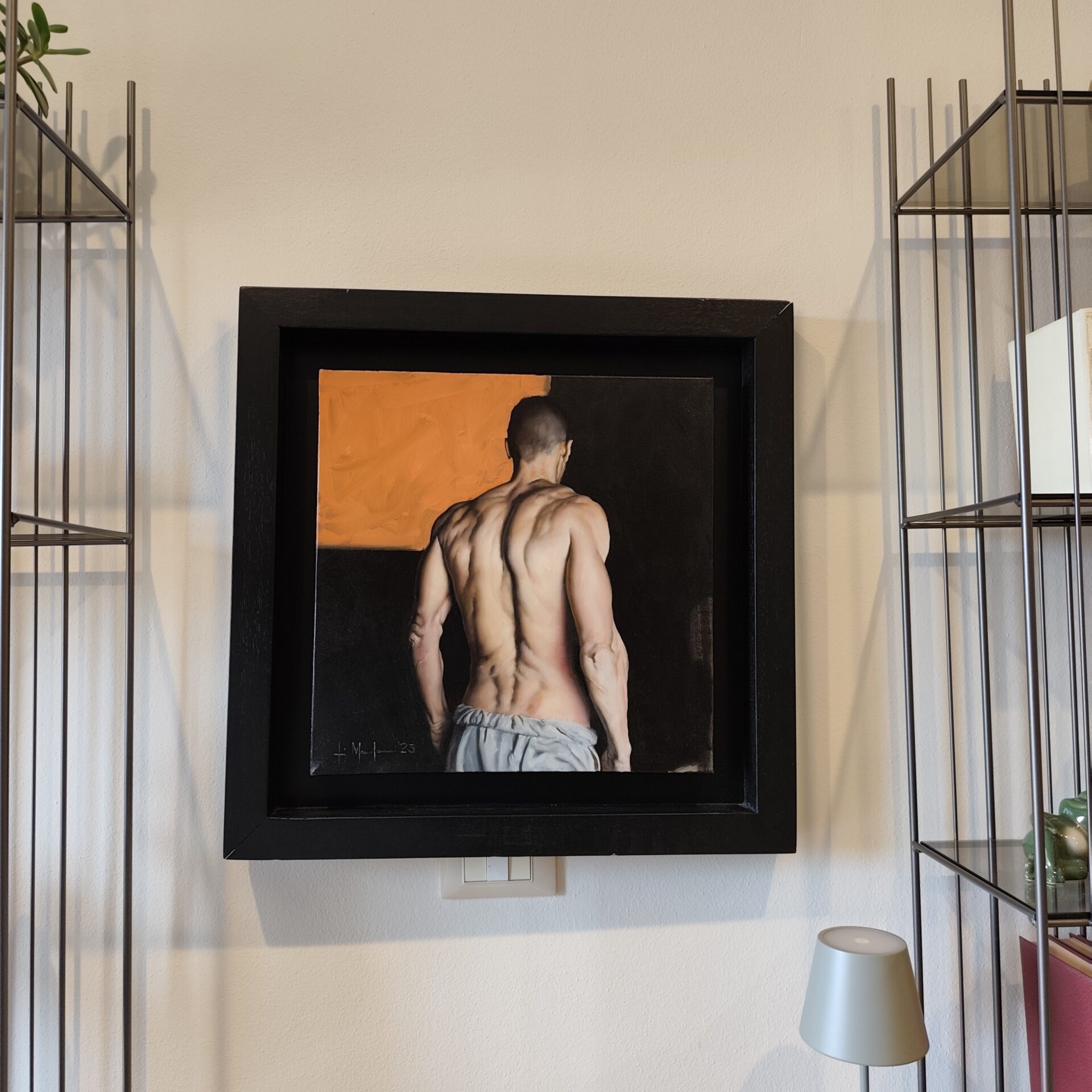 La metà inferiore del dipinto è dominata da un nero profondo e assoluto, mentre la parte superiore esplode in un arancione vibrante. Contro questo sfondo da “color field painting”, si staglia il dorso maschile, reso con una precisione anatomica e una sensibilità per la luce che sono il marchio di fabbrica dell’iperrealismo di Manfroni. È proprio questo contrasto a rendere l’opera così potente: la fisicità quasi tattile del corpo umano contro la purezza concettuale dell’astrazione.