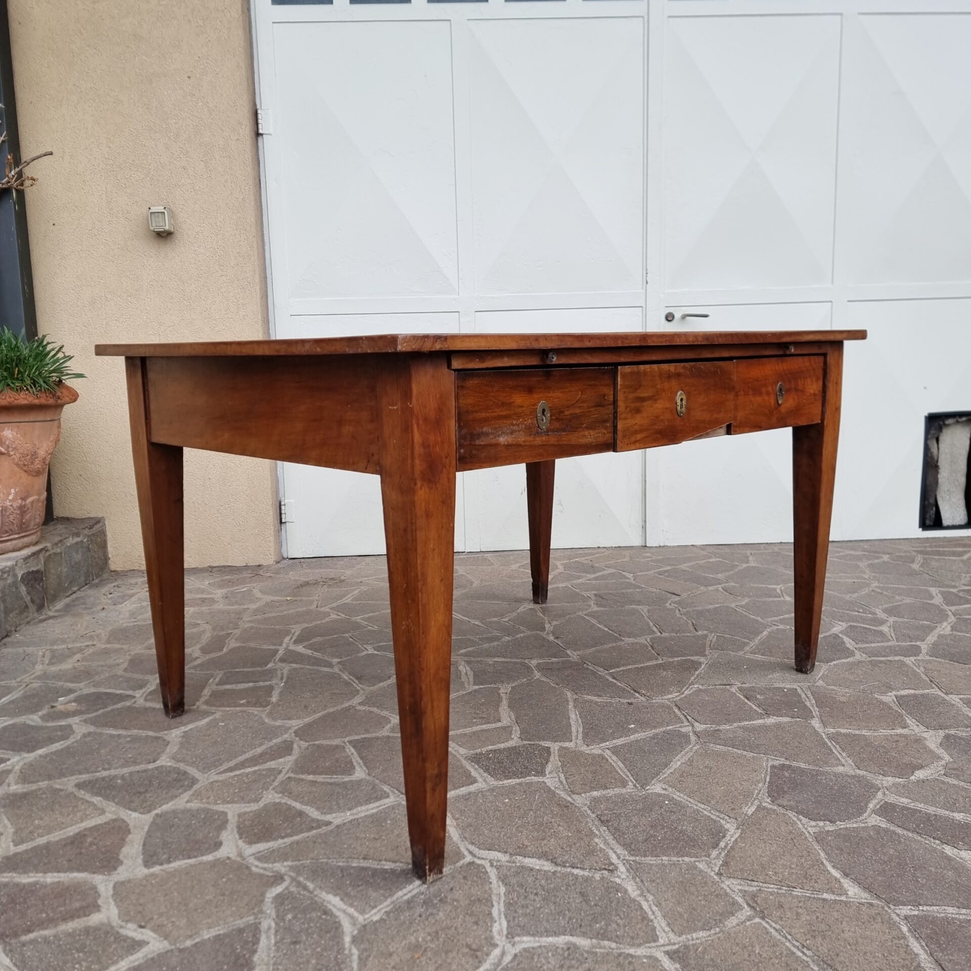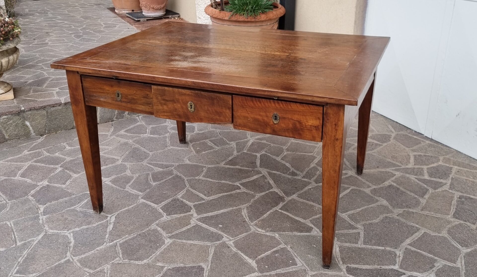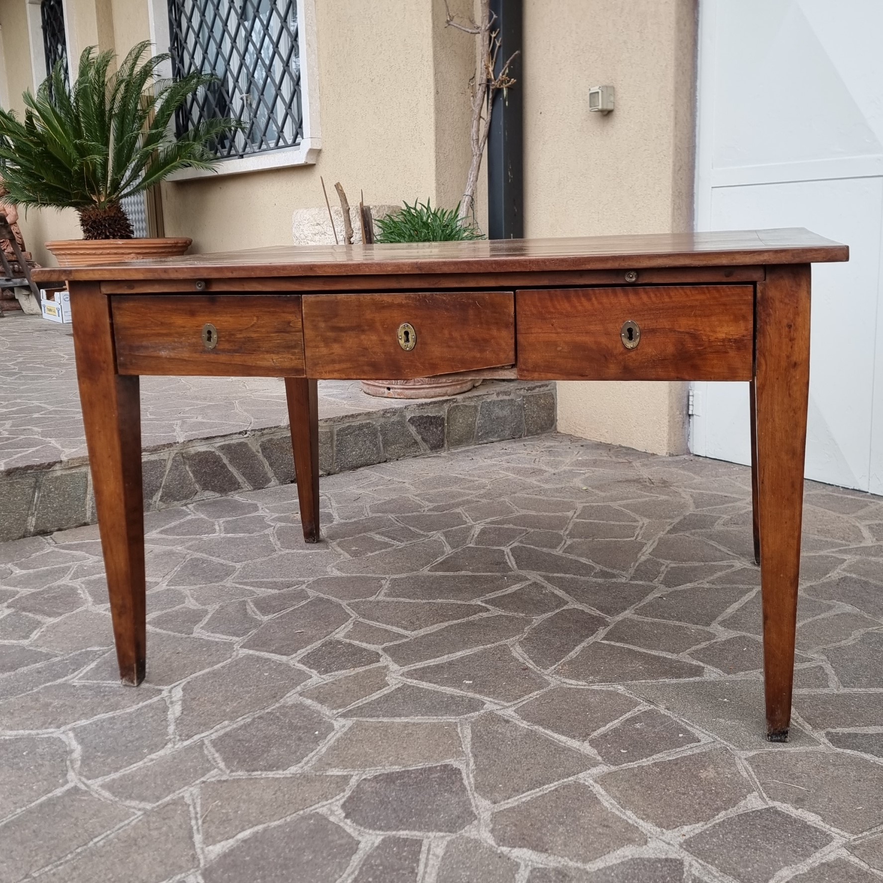La bellezza di questo scrittoio antico risiede nella sua essenzialità. L’ampio piano rettangolare, lastronato con pregevole noce per esaltarne la venatura, offre una superficie di lavoro generosa. La fascia sottostante ospita tre comodi cassetti, perfettamente integrati nella linea del mobile. L’intera struttura è sorretta da quattro eleganti gambe a spillo troncoconiche, un dettaglio che conferisce slancio e leggerezza visiva pur garantendo una perfetta stabilità. La calda patina del noce testimonia l’autenticità e i secoli di storia del mobile.