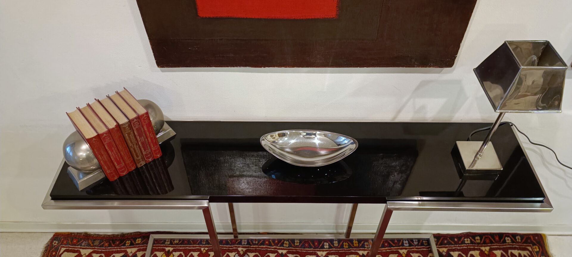 Crea un ambiente di straordinaria eleganza simmetrica con questa rara coppia di consolle di design degli anni ’80, un esempio perfetto dello stile post-moderno che unisce il rigore geometrico dell’acciaio alla profondità del laccato nero lucido. Disponibili anche singolarmente.