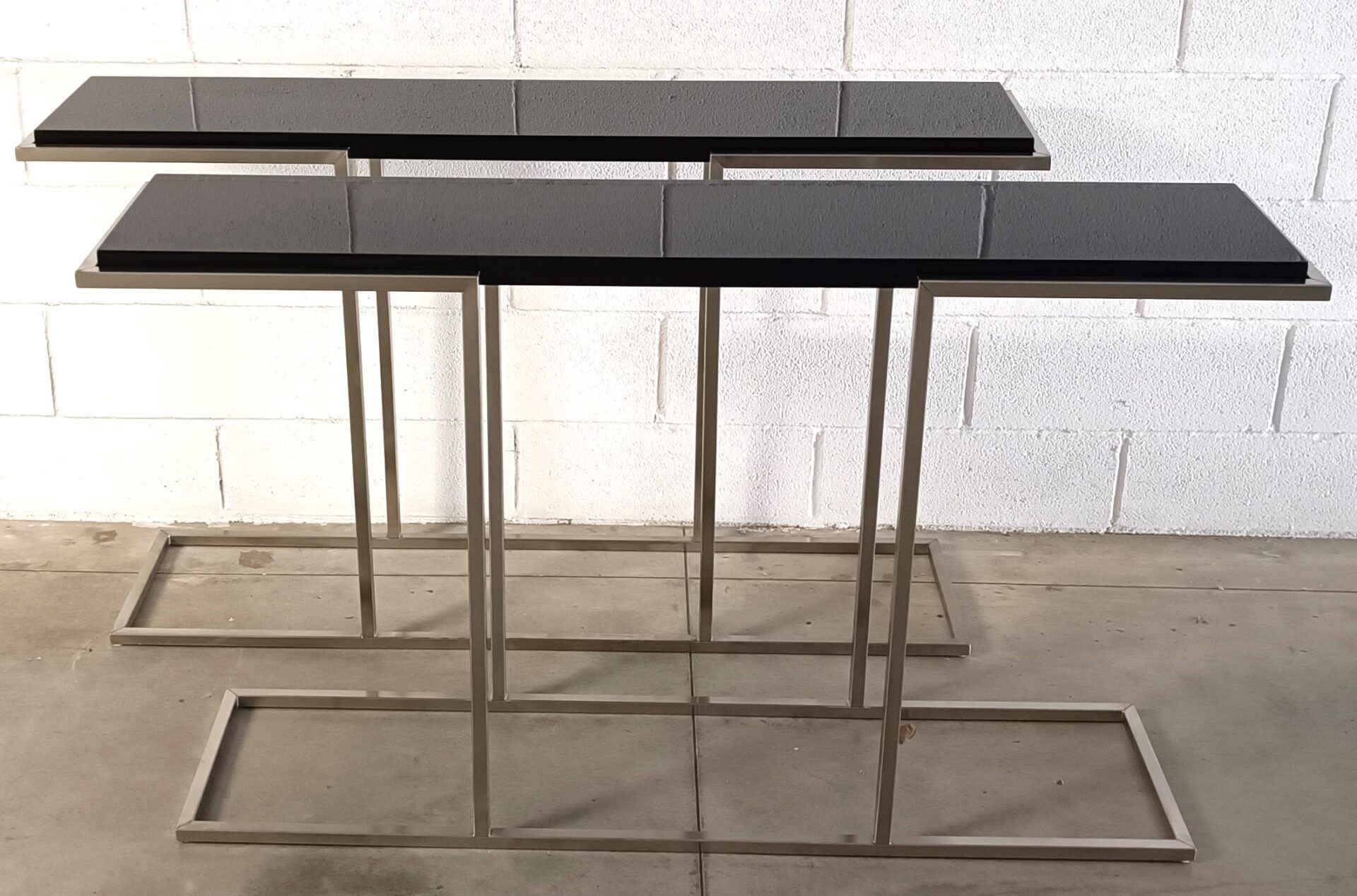 Queste consolle sono un’espressione magnifica del design degli anni Ottanta, un decennio che ha riscoperto il piacere delle forme architettoniche, dei materiali industriali e di un’eleganza grafica e audace. Nello stile di grandi maestri del design italiano, questo pezzo gioca sul contrasto tra la freddezza del metallo e l’assoluto del nero, creando un oggetto che è al tempo stesso un mobile funzionale e una scultura moderna.